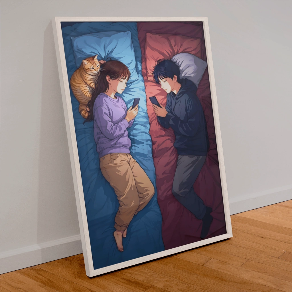 Zıt Renklerin Büyüsü, Parçaların Kusursuz Uyumu 48x68 cm boyutlarındaki bu dev serüvende, mavinin soğuk tonları ile pembe/kırmızının sıcak geçişleri arasında bir denge kuracaksınız. Her bir parçayı yerine koyarken; nevresimlerin kumaş dokusunu, telefonlardan yansıyan o loş ışığı ve kedinin tüylerindeki o yumuşak parıltıyı hissedeceksiniz. Bu puzzle sadece sabrınızı test etmeyecek; aynı zamanda size modern hayatın içindeki o "huzurlu yalnızlığı" yeniden sorgulatacak.